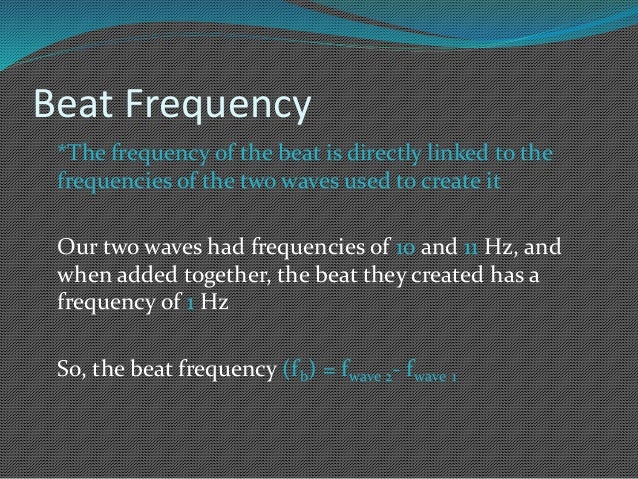 Finally, take the absolute value. If you set the difference to 2hz, the beat will occur twice. Is the count of beats per second the same as the frequency? The beat frequency is equal to the absolute value of the differencein frequency of the two waves. So if two sound waves with frequencies of 256 hz and 254 hz are played simultaneously, a beat frequency of 2 hz will be detected. It's worth pointing out that there are two times that the envelope passes through zero for every wavelength, so the beat frequency is twice the frequency of the envelope and is given by the magnitude of the difference of the two frequencies. The count of beats per second is equivalent to the difference in frequencies of two waves is called beat frequency. When do two waves of the same frequency meet? More images for how to find the beat frequency of two waves » F 1 and f 2 are the frequency of two waves. Which is the absolute value of the beat frequency? Lets' keep one at a constant frequency and let's let the other one constantly increase. The formula for beat frequency is the difference in frequency of the two superimposed waves.